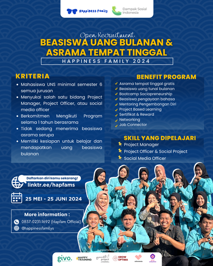 Happiness Family Scholarship hadir untuk membuka akses penunjang pendidikan mahasiswa lebih merata dengan program mentorship pengembangan diri, dan menghadirkan beasiswa pelatihan kewirausahaan sosial untuk meningkatkan kemandirian dan social life skill sejak mahasiswa.